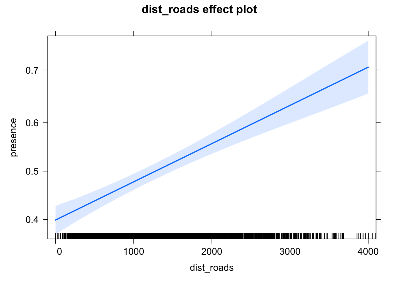 fit <- glm(presence ~ dist_roads, family = binomial, data = elk_data)