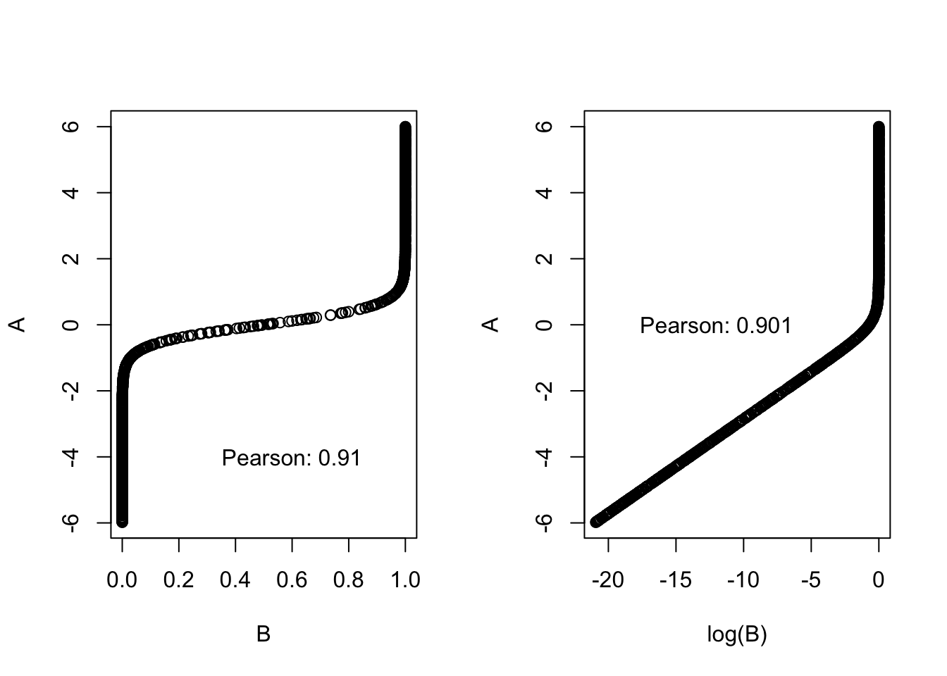 A =runif(1000, -6, 6) # creating A variableB =plogis(A*3.5) # creating B variable par(mfrow =c(1, 2)) # for plotting the plots side by sideplot(B, A)text(x =0.6, y =-4, paste0("Pearson: ", round(cor(A, B, method ="pearson"), 3))) plot(log(B), A)text(x =-12, y =0, paste0("Pearson: ", round(cor(A, log(B), method ="pearson"), 3)))