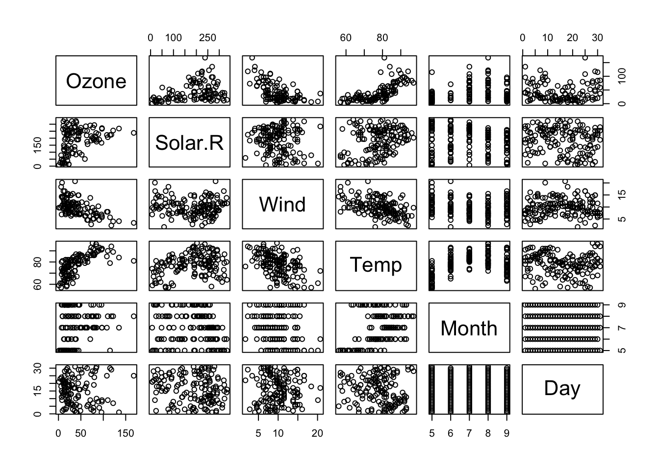 airquality[is.na(airquality$Ozone),] ## Ozone Solar.R Wind Temp Month Day## 5 NA NA 14.3 56 5 5## 10 NA 194 8.6 69 5 10## 25 NA 66 16.6 57 5 25## 26 NA 266 14.9 58 5 26## 27 NA NA 8.0 57 5 27## 32 NA 286 8.6 78 6 1## 33 NA 287 9.7 74 6 2## 34 NA 242 16.1 67 6 3## 35 NA 186 9.2 84 6 4## 36 NA 220 8.6 85 6 5## 37 NA 264 14.3 79 6 6## 39 NA 273 6.9 87 6 8## 42 NA 259 10.9 93 6 11## 43 NA 250 9.2 92 6 12## 45 NA 332 13.8 80 6 14## 46 NA 322 11.5 79 6 15## 52 NA 150 6.3 77 6 21## 53 NA 59 1.7 76 6 22## 54 NA 91 4.6 76 6 23## 55 NA 250 6.3 76 6 24## 56 NA 135 8.0 75 6 25## 57 NA 127 8.0 78 6 26## 58 NA 47 10.3 73 6 27## 59 NA 98 11.5 80 6 28## 60 NA 31 14.9 77 6 29## 61 NA 138 8.0 83 6 30## 65 NA 101 10.9 84 7 4## 72 NA 139 8.6 82 7 11## 75 NA 291 14.9 91 7 14## 83 NA 258 9.7 81 7 22## 84 NA 295 11.5 82 7 23## 102 NA 222 8.6 92 8 10## 103 NA 137 11.5 86 8 11## 107 NA 64 11.5 79 8 15## 115 NA 255 12.6 75 8 23## 119 NA 153 5.7 88 8 27## 150 NA 145 13.2 77 9 27# orsummary(airquality)## Ozone Solar.R Wind Temp ## Min. : 1.00 Min. : 7.0 Min. : 1.700 Min. :56.00 ## 1st Qu.: 18.00 1st Qu.:115.8 1st Qu.: 7.400 1st Qu.:72.00 ## Median : 31.50 Median :205.0 Median : 9.700 Median :79.00 ## Mean : 42.13 Mean :185.9 Mean : 9.958 Mean :77.88 ## 3rd Qu.: 63.25 3rd Qu.:258.8 3rd Qu.:11.500 3rd Qu.:85.00 ## Max. :168.00 Max. :334.0 Max. :20.700 Max. :97.00 ## NA's :37 NA's :7 ## Month Day ## Min. :5.000 Min. : 1.0 ## 1st Qu.:6.000 1st Qu.: 8.0 ## Median :7.000 Median :16.0 ## Mean :6.993 Mean :15.8 ## 3rd Qu.:8.000 3rd Qu.:23.0 ## Max. :9.000 Max. :31.0 ##