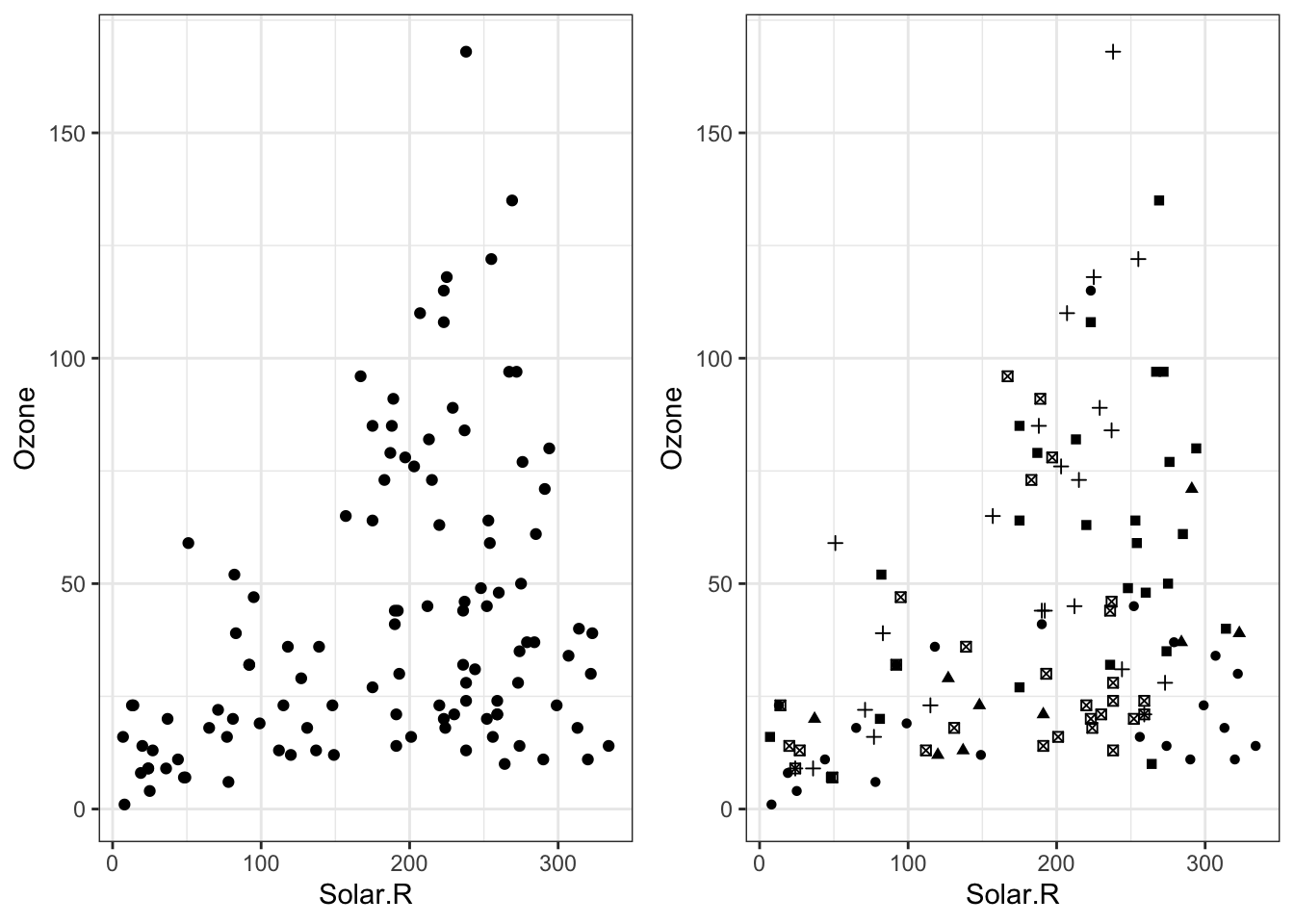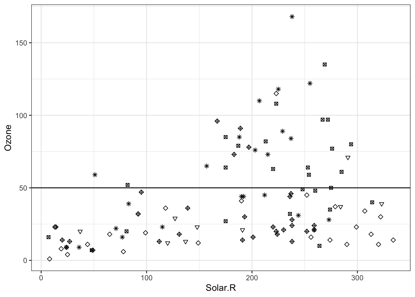 ggplot(airquality, aes(x = Solar.R, y = Ozone)) +geom_point(shape = airquality$Month) +geom_abline(intercept =50, slope =0) +theme_bw()## Warning: Removed 42 rows containing missing values or values outside the scale range## (`geom_point()`).