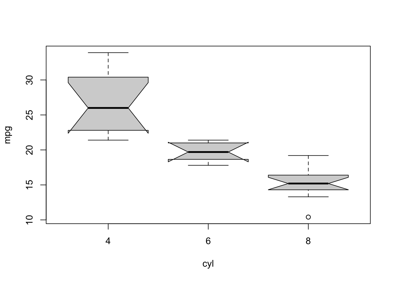boxplot(mpg ~ cyl, mtcars, notch=TRUE) # formula notation