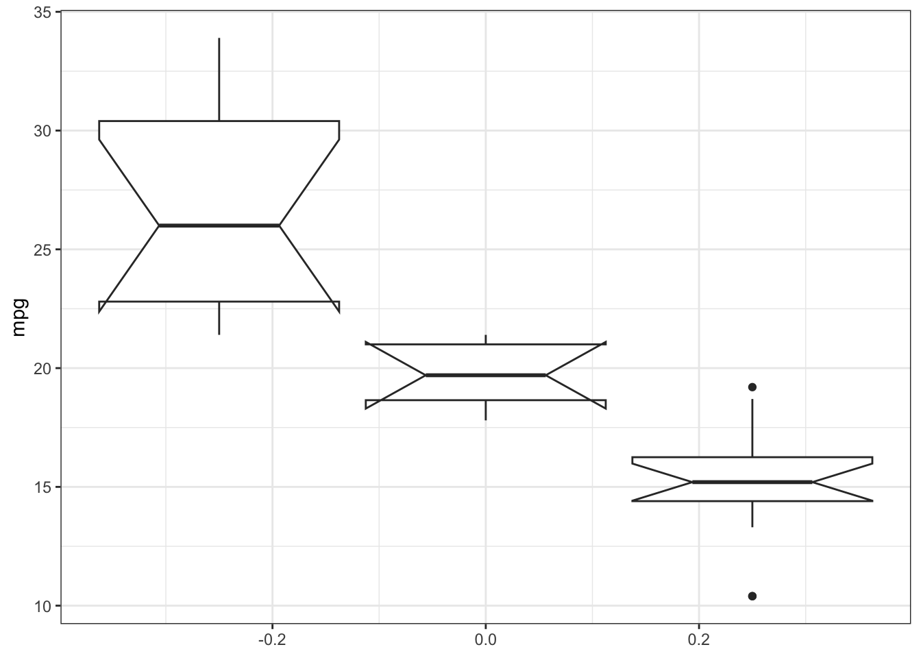 ggplot(mtcars, aes(y = mpg, group = cyl)) +geom_boxplot(notch=TRUE) +theme_bw()## Notch went outside hinges## ℹ Do you want `notch = FALSE`?## Notch went outside hinges## ℹ Do you want `notch = FALSE`?