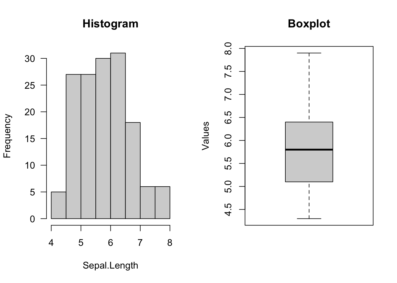 par(mfrow =c(1,2)) # number of plots, one row, two columnshist(iris$Sepal.Length, main ="Histogram", # titlexlab ="Sepal.Length", ylab ="Frequency",las =1) # rotation of x and y values (las = 1, all of them should be horizontal)boxplot(iris$Sepal.Length, main ="Boxplot", # titleylab ="Values")