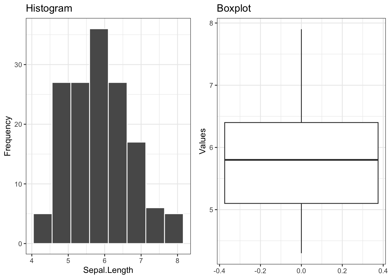 library(ggplot2)library(ggpubr)plt1 =ggplot(iris, aes(x = Sepal.Length)) +geom_histogram(bins =8,col="white") +# same number of bins from baseRggtitle("Histogram") +xlab("Sepal.Length") +ylab("Frequency") +theme_bw() # scientific theme (white background)plt2 =ggplot(iris, aes(y = Sepal.Length)) +geom_boxplot() +ggtitle("Boxplot") +ylab("Values") +theme_bw() ggarrange(plt1, plt2, ncol =2L, nrow =1L)