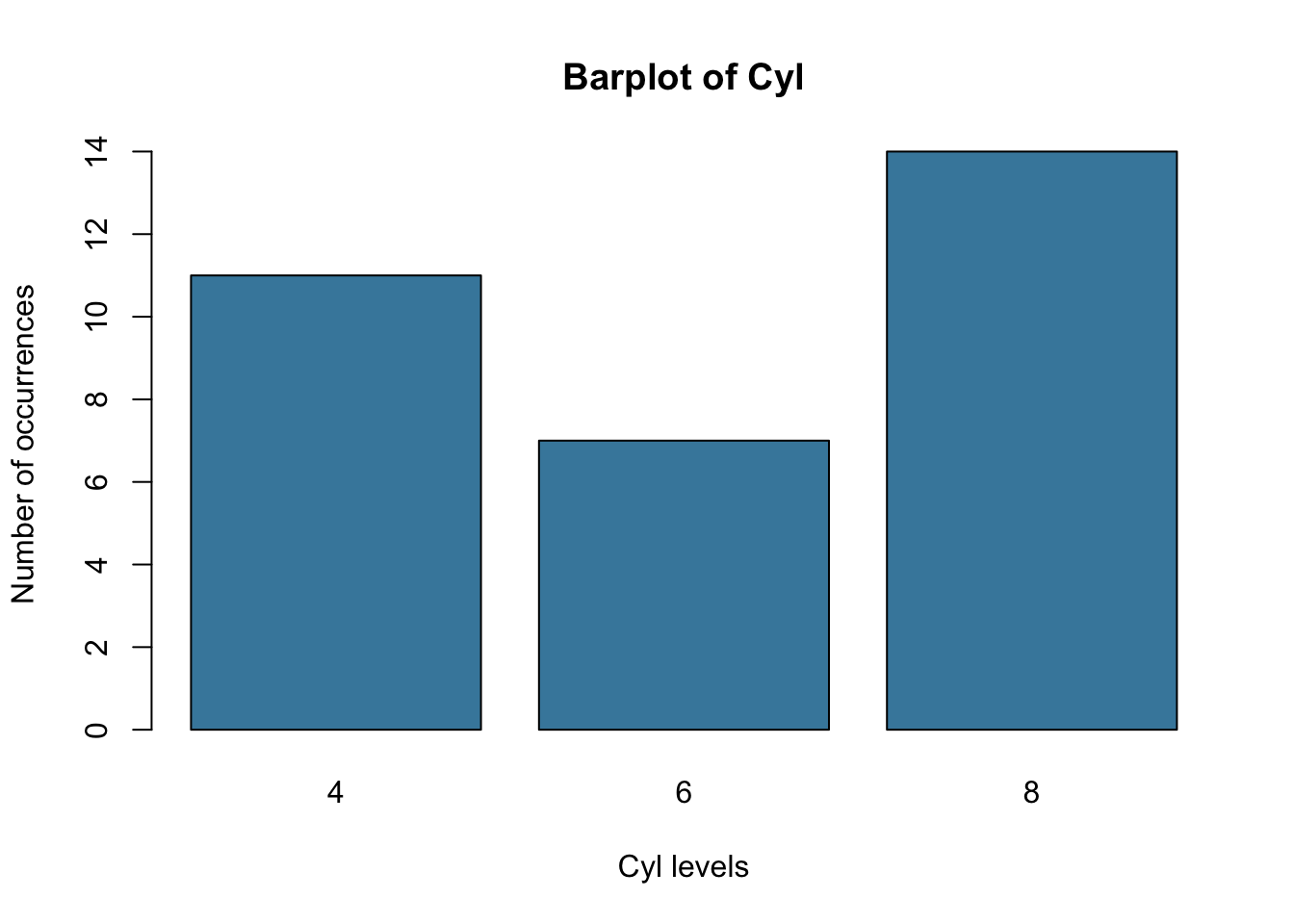 barplot(counts, main ="Barplot of Cyl",ylab ="Number of occurrences",xlab ="Cyl levels",col ="#4488AA")