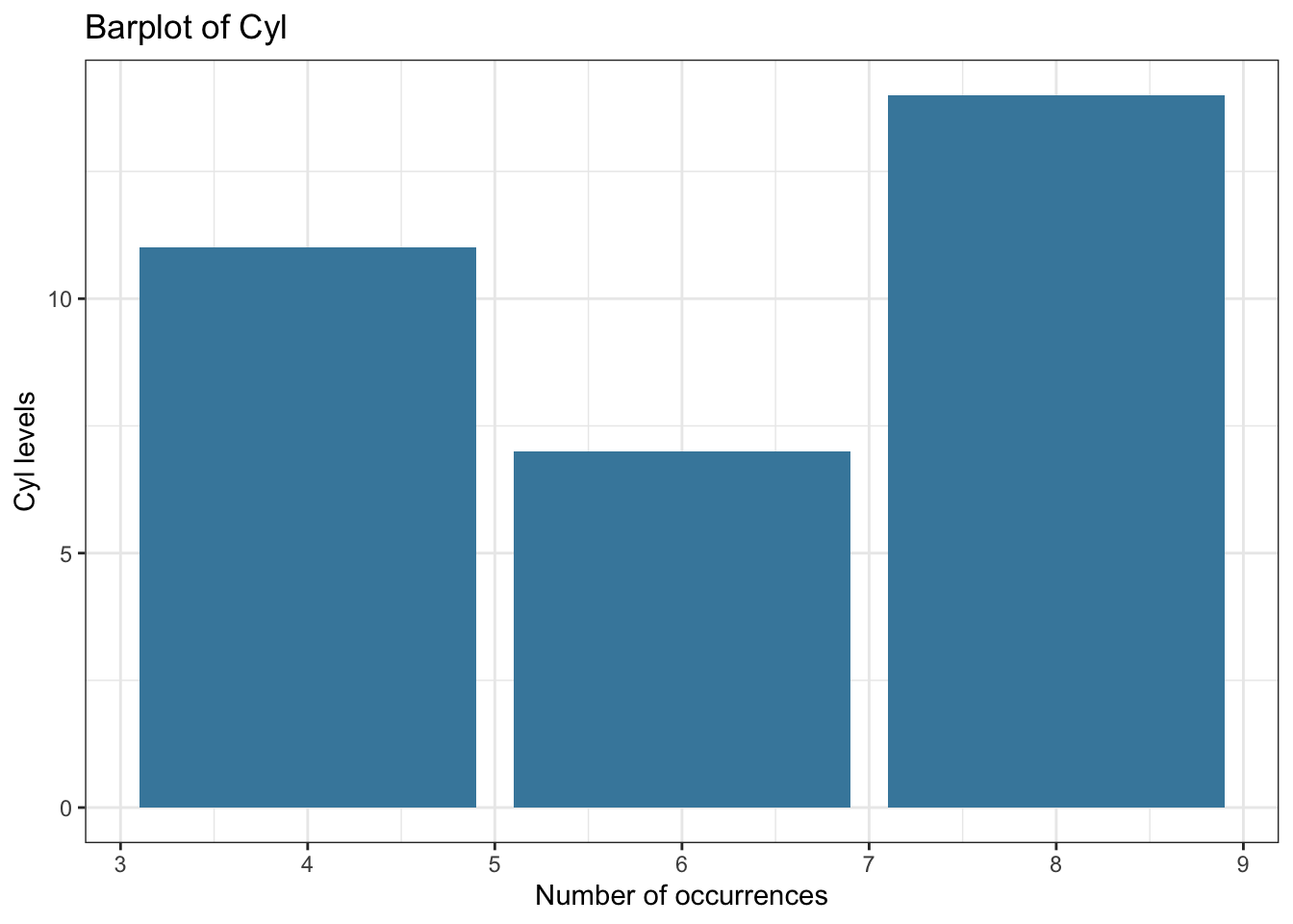 ggplot(mtcars, aes(x = cyl)) +geom_bar(fill ="#4488AA") +ggtitle("Barplot of Cyl") +xlab("Number of occurrences") +ylab("Cyl levels") +theme_bw()