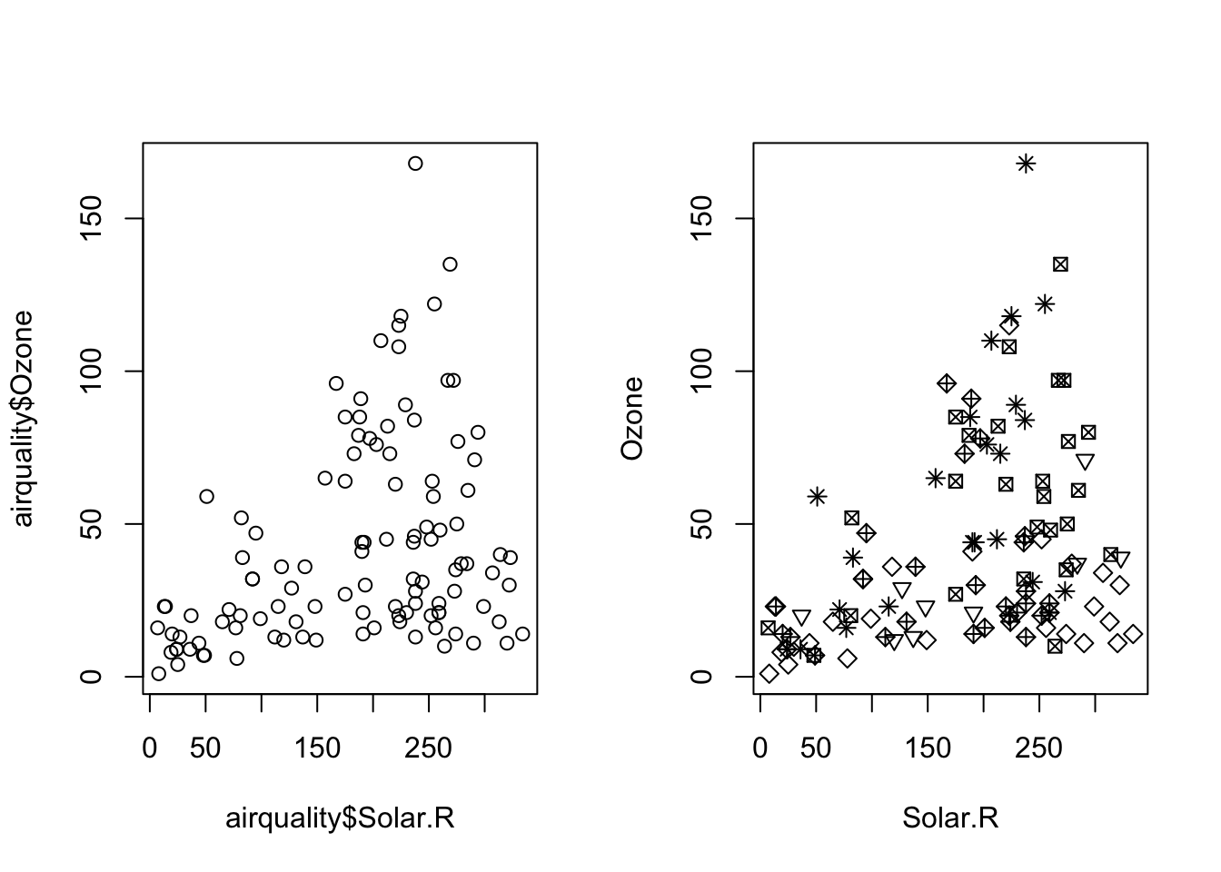 # Scatterplotpar(mfrow =c(1,2))plot(airquality$Solar.R, airquality$Ozone)# plot(Ozone ~ Solar.R, data = airquality) #the same# different symbol for each monthplot(Ozone ~ Solar.R, data = airquality, pch = Month)