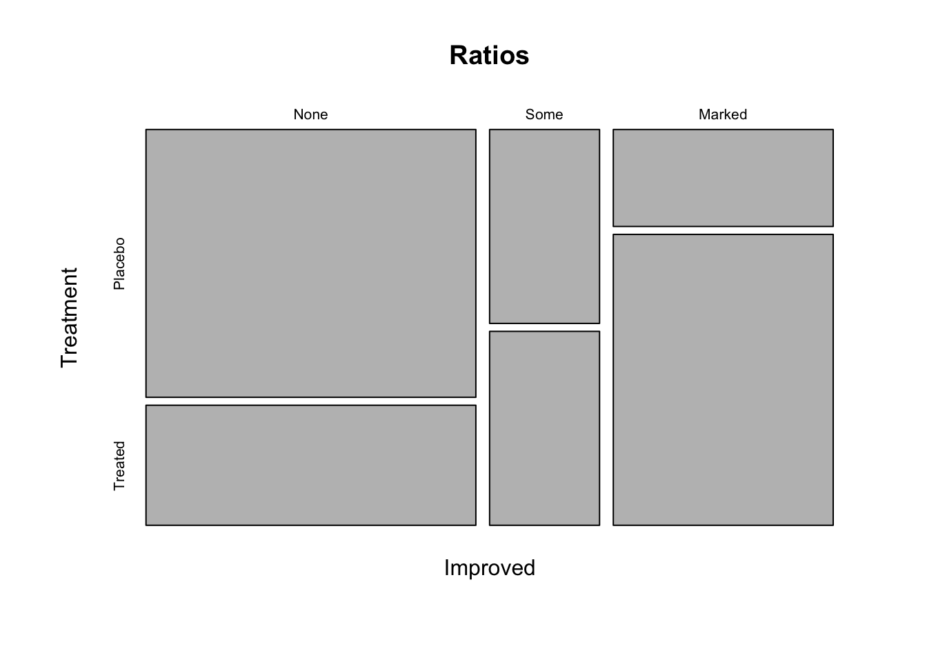 Ratios <- table(Improved = dat$Improved, Treatment = dat$Treatment) # create a table with the assigned name "ratios", give the name "Improved" to the first variable which is the variable Improved from the data set Arthritis, give the name "Treatment" to the second variable which is the variable Treatment from the data set Arthritis