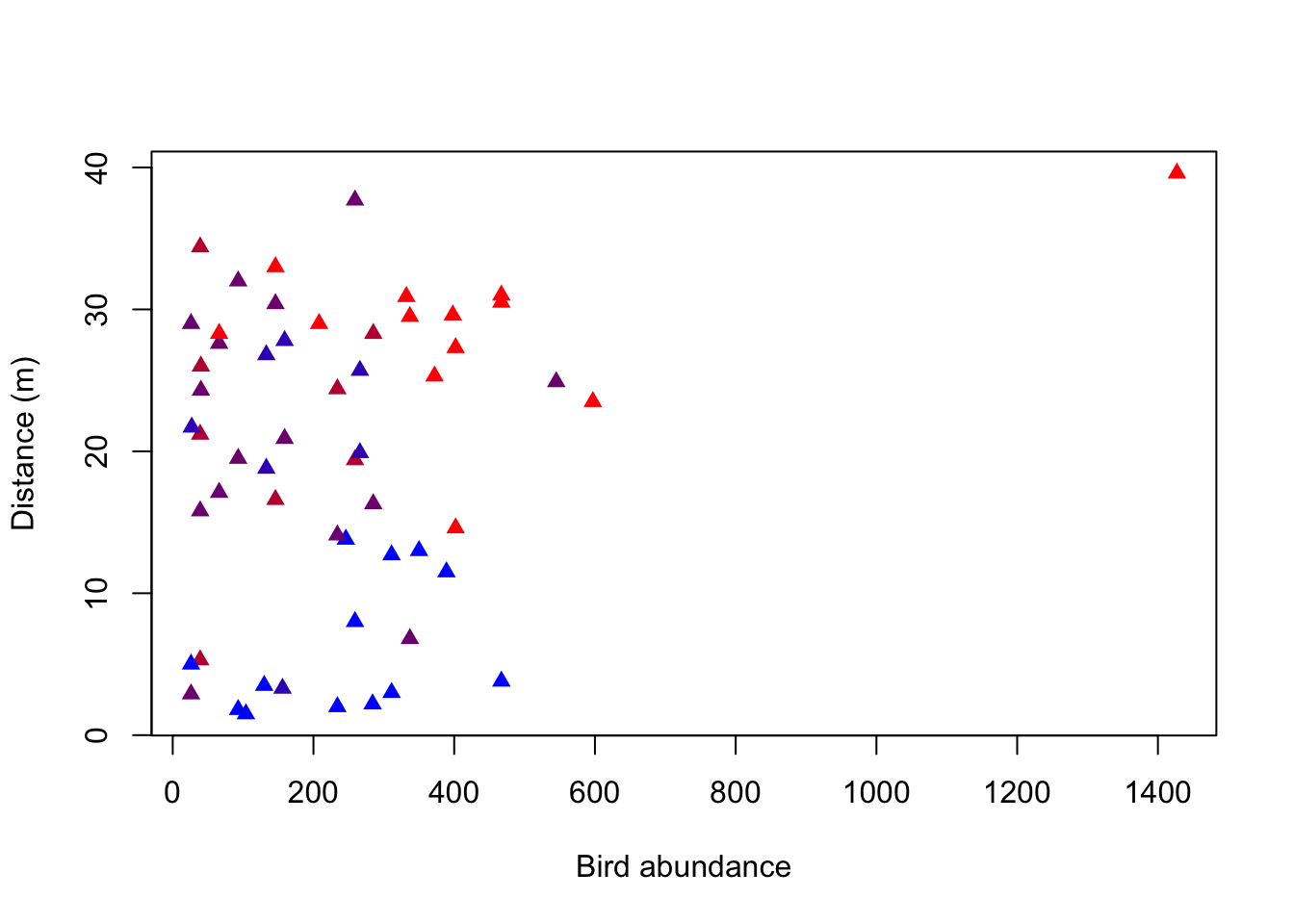 abline(v = median(birdabundance$DIST), col = "purple") # add a vertical line with an x value equal to the median of the variable distance