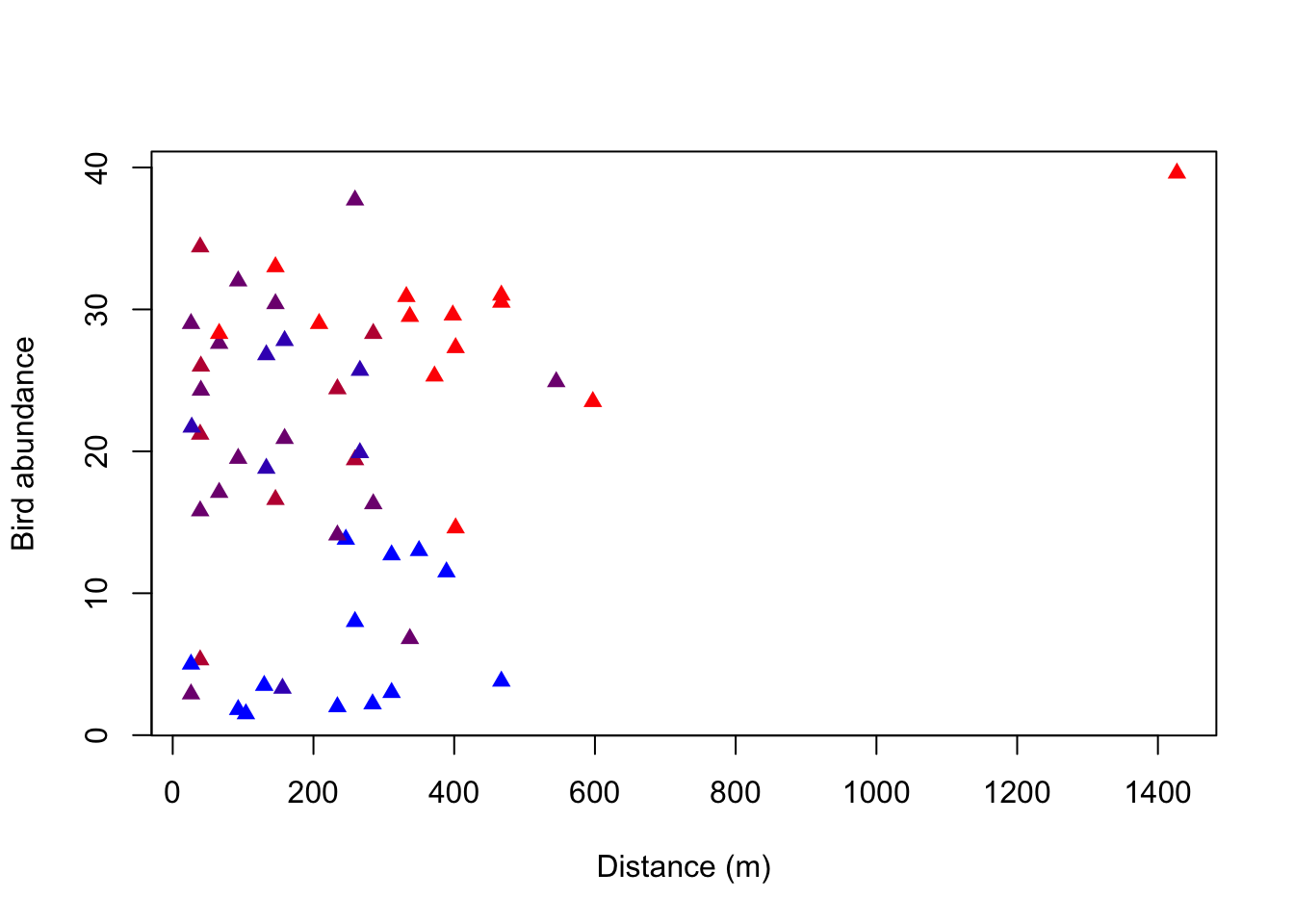 help(birdabundance)The dataset has been assessed by scientists in Australia who counted birds in forest fragments and looked for drivers that influence these bird abundances, e.g., the size of a forest fragment and the distance to the next fragment. We want to see how these distances vary. A histogram is the standard figure to depict one numerical variable, such as for example distance measurements.