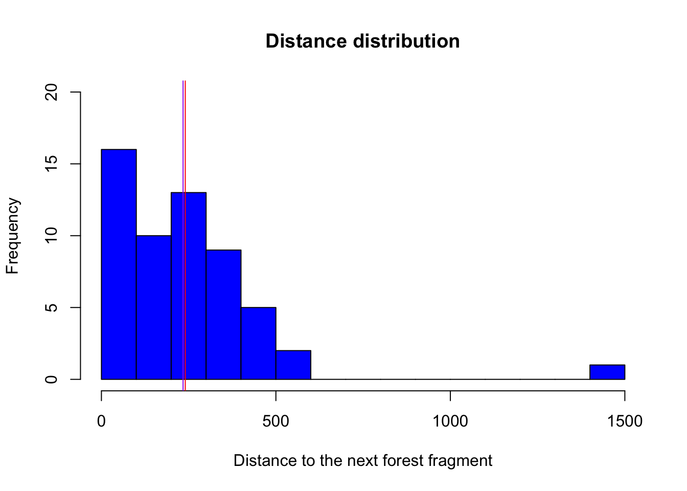 The red line represents the mean distance between forest fragments, while the purple line represents the median.